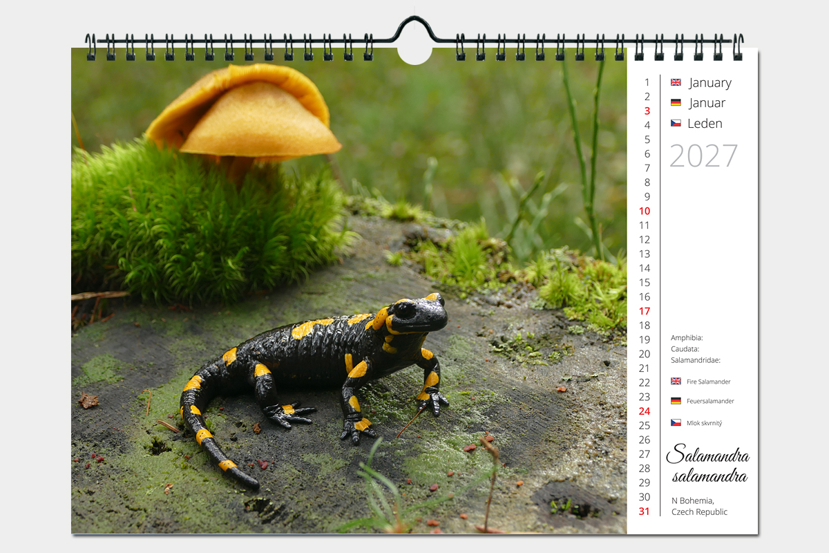 Titulní strana kalendáře "Obojživelníci" - pro rok 2027. Kalendář je formátu A3, plnobarevný, tištěný na kvalitním křídovém papíře.