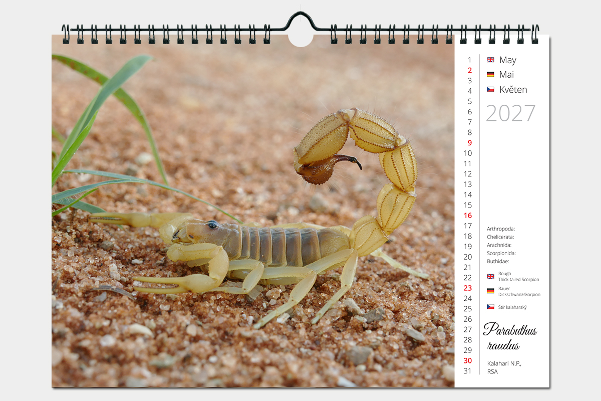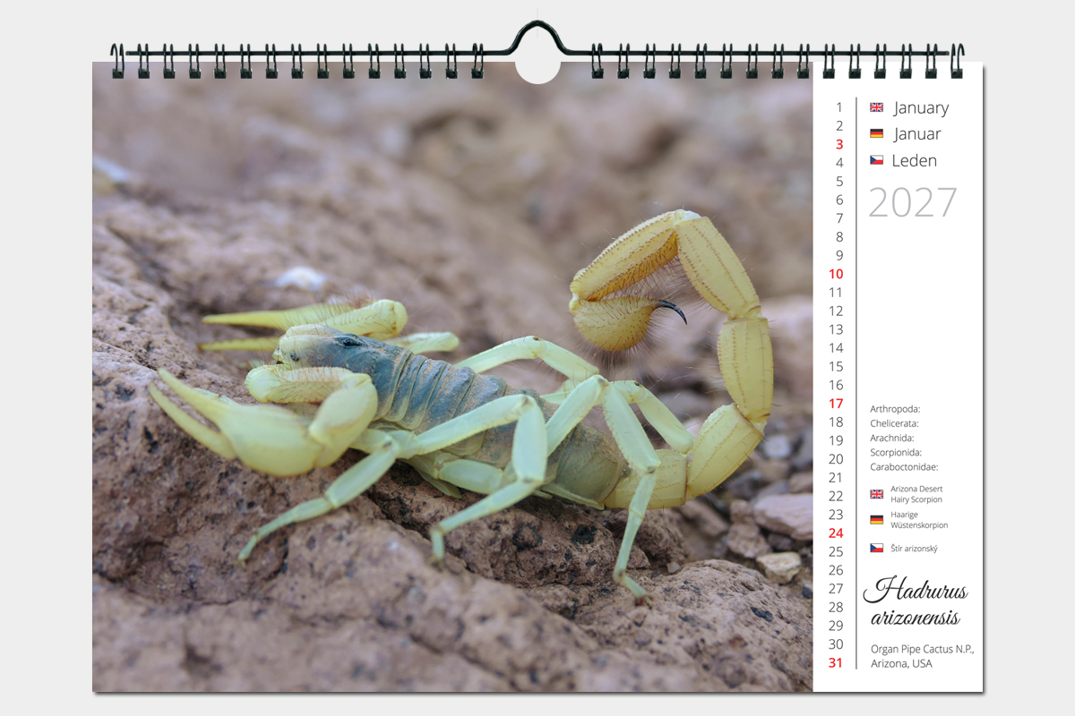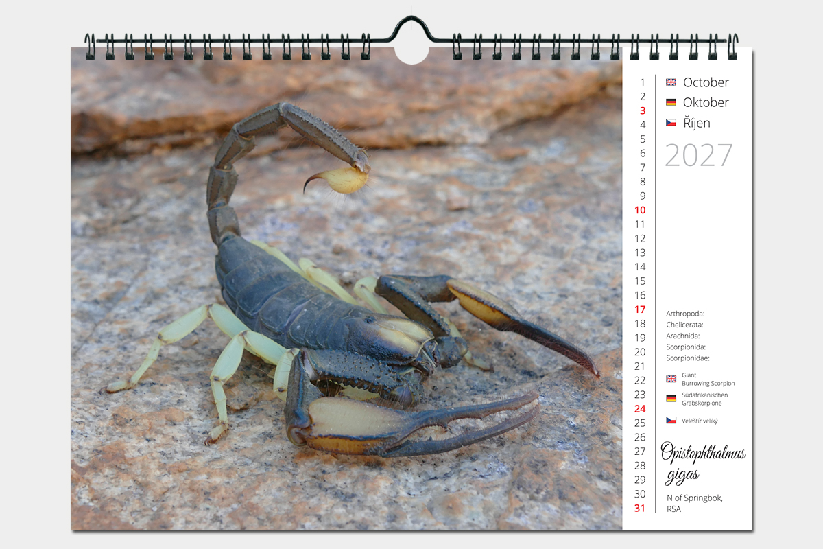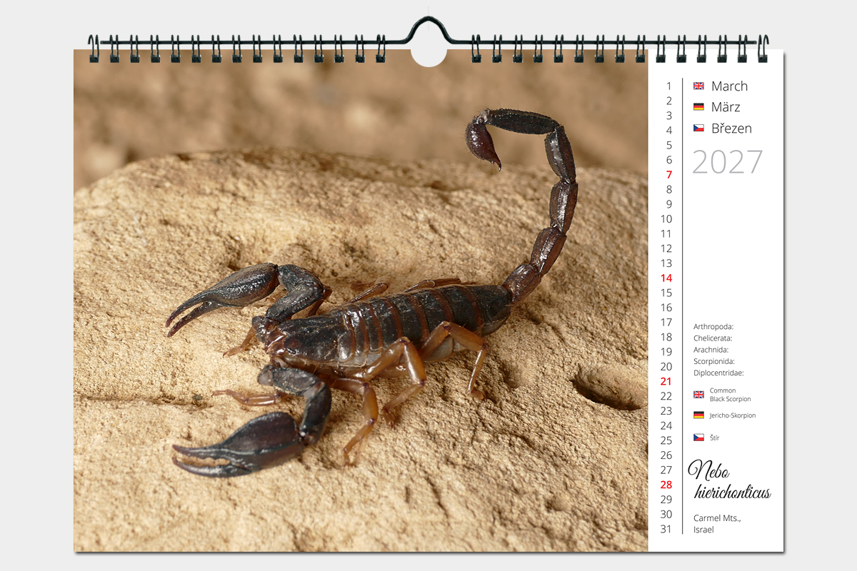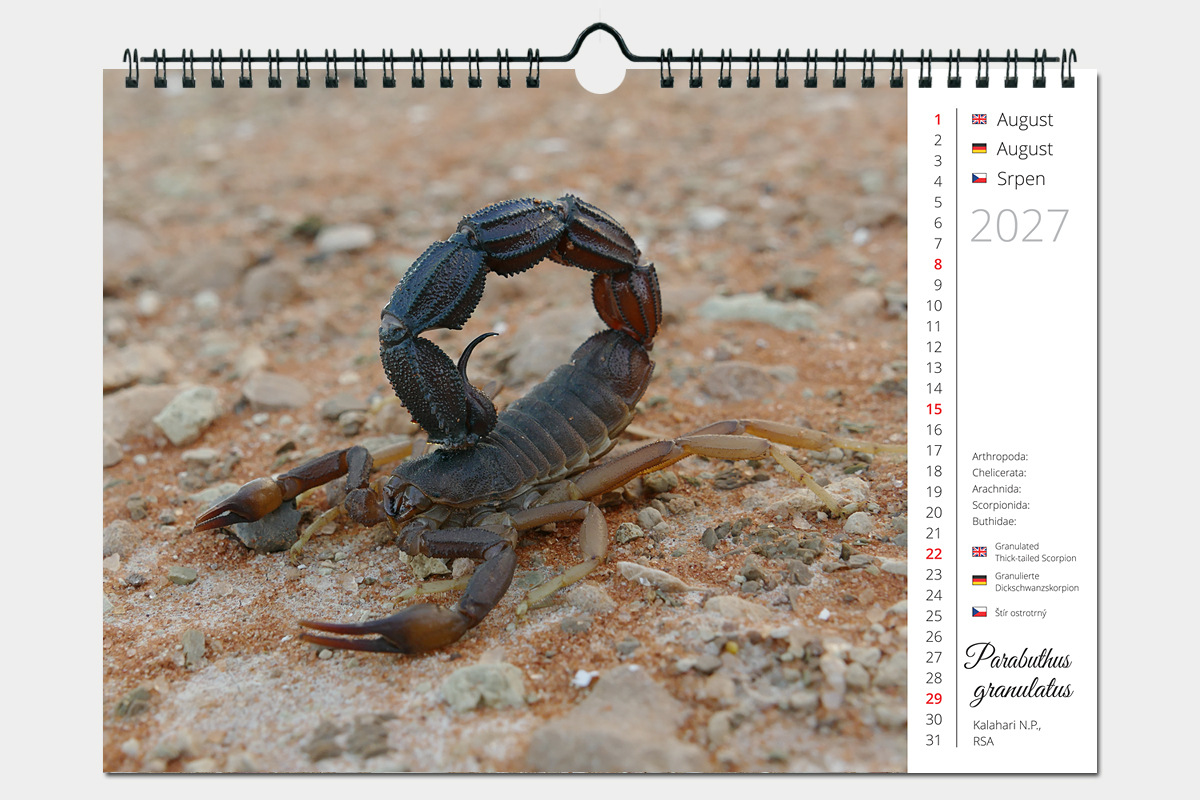 Titulní strana kalendáře "Štíři" - pro rok 2027. Kalendář je formátu A3, plnobarevný, tištěný na kvalitním křídovém papíře.