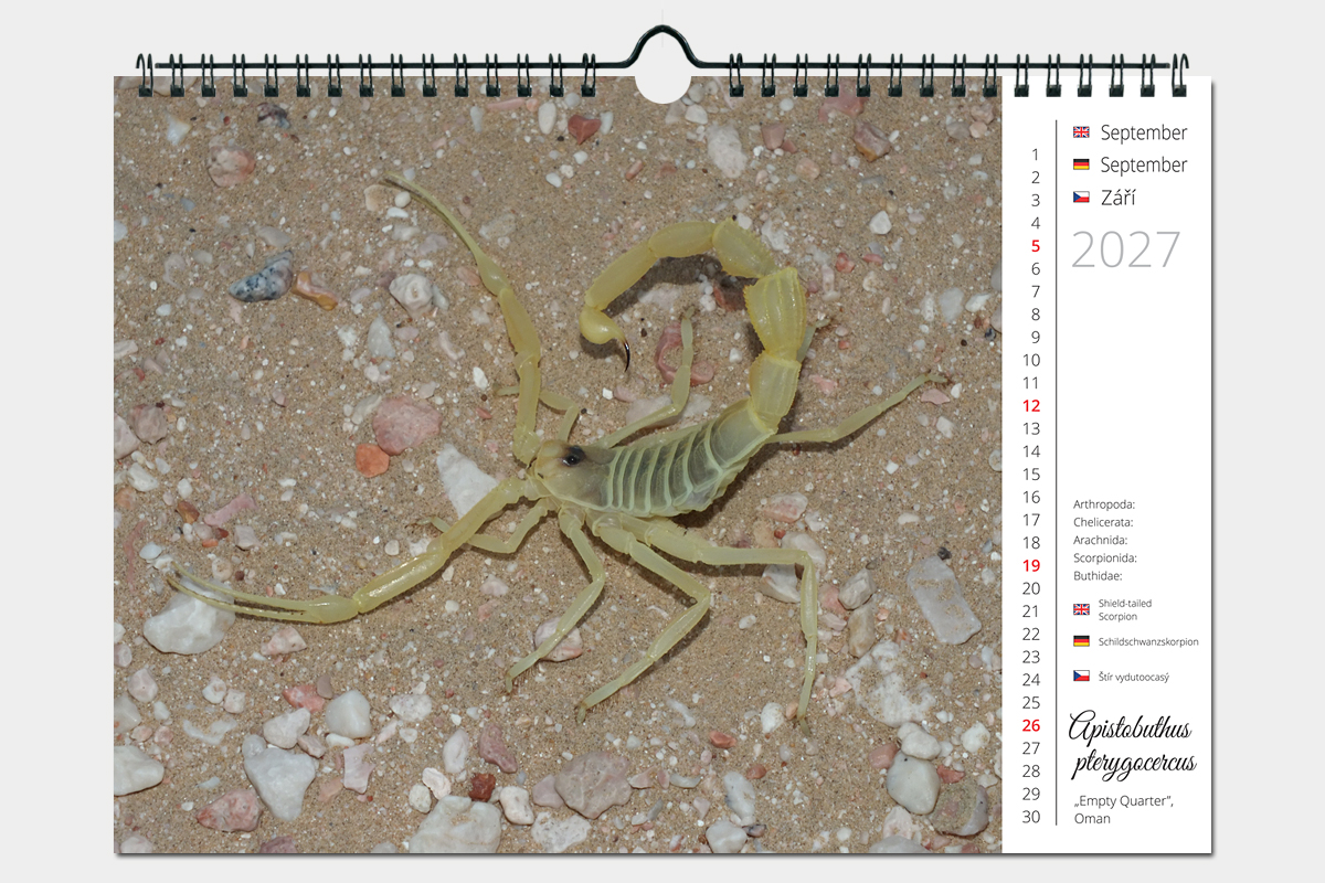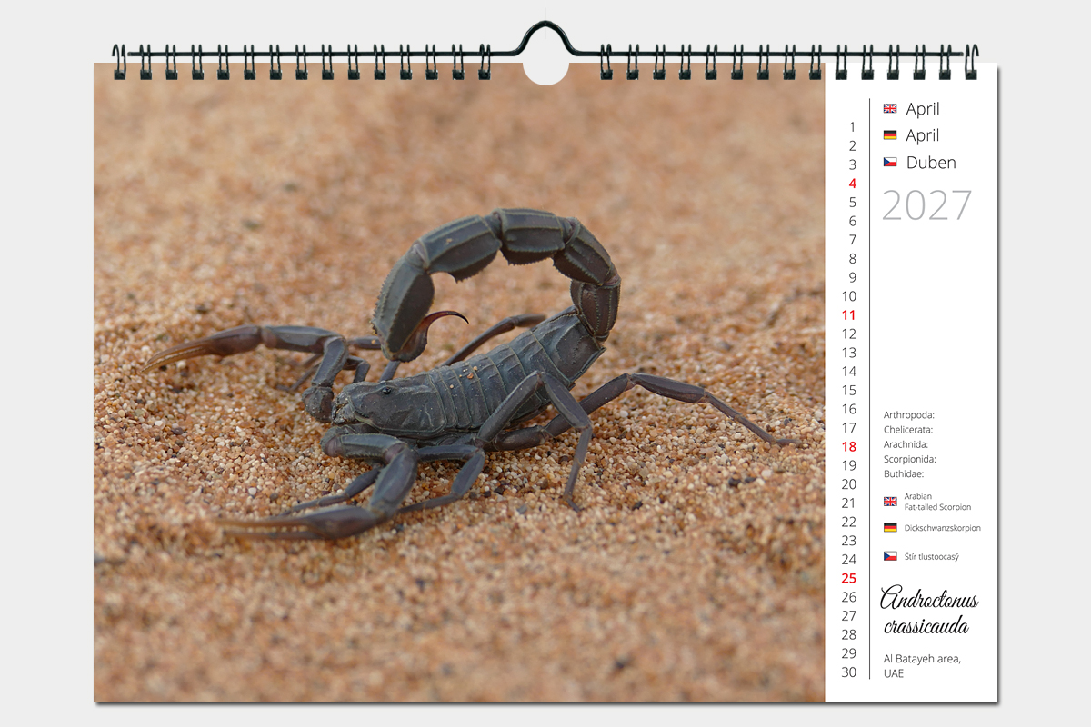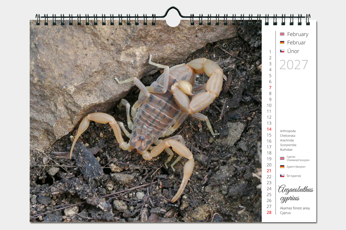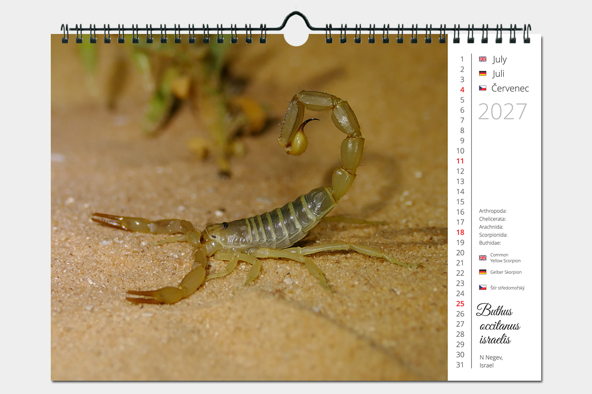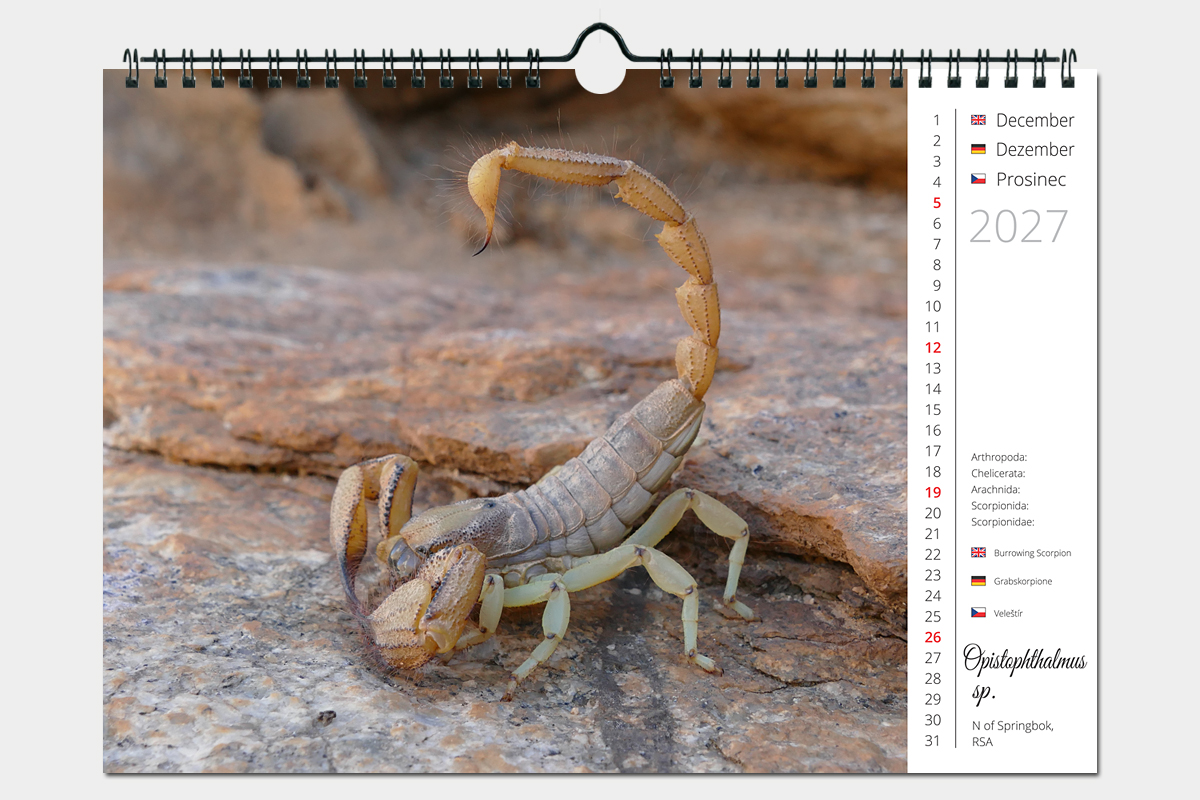 Titulní strana kalendáře "Štíři" - pro rok 2027. Kalendář je formátu A3, plnobarevný, tištěný na kvalitním křídovém papíře.